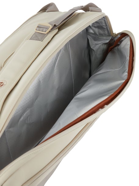 尺寸:長30吋 x 高14吋 x 深12吋兩個主球拍隔間,其中一個採用 Thermoguard 技術,每個隔間最多可容納 5 個球拍兩側有兩個大配件口袋,內部配有網袋,可讓所有物品井然有序可調節的帶襯墊肩帶,可作為背包或肩背可拆式鞋袋抓住末端和頂部的手柄顏色:奶油色 / 黏土色 / 灰色
