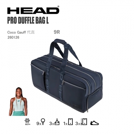 以觸感舒適、外觀近似時尚包款常用材質的布料製成,PRO DUFFLE BAG L 以俐落的海軍藍風格,無論在場上或日常皆百搭。背帶上的 壓紋 HEAD 標誌 提升整體質感;此款作為 HEAD 全新「生活與時尚靈感」系列的一員,兼具多變用途與高質感外觀。精緻設計結合現代機能——配置多個收納空間,能輕鬆攜帶並保護你的球拍、筆電與個人物品,同時具備穩定性與輕量耐用度,適合每日使用。
